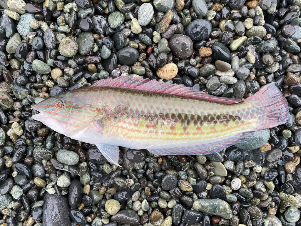 この日は5月上旬。さすがにハタはまだ居ない時期ですが、1投目で巨大なキュウセンがヒット。わざわざ狙う人もおらず、磯周りの豊富なエサを食べているためか、堤防ではあり得ないサイズにまで成長しています。