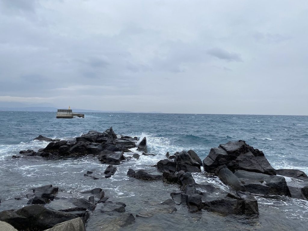 今回のポイントは歩道からも近くアクセスが容易い場所なのですが、時化のため磯には乗れず、奥の石積みからテトラ越しに竿を出すことに。