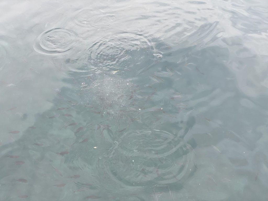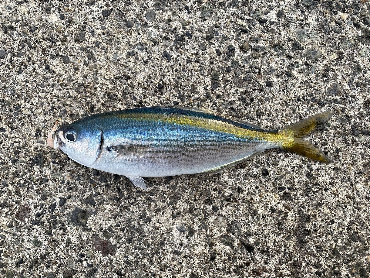 手始めに堤防の外側でコマセを撒いてみると、今日もタカベが沢山集まってきました。スズメダイと混泳していますが、青と黄の魚体が特徴的なのですぐにわかります。