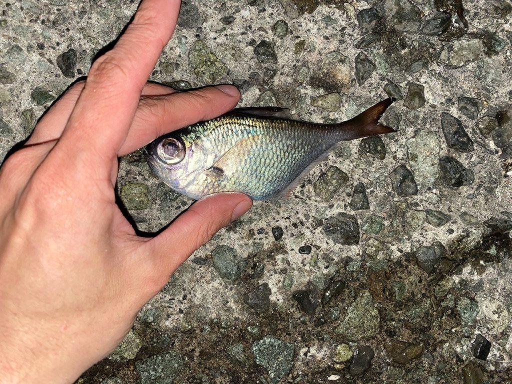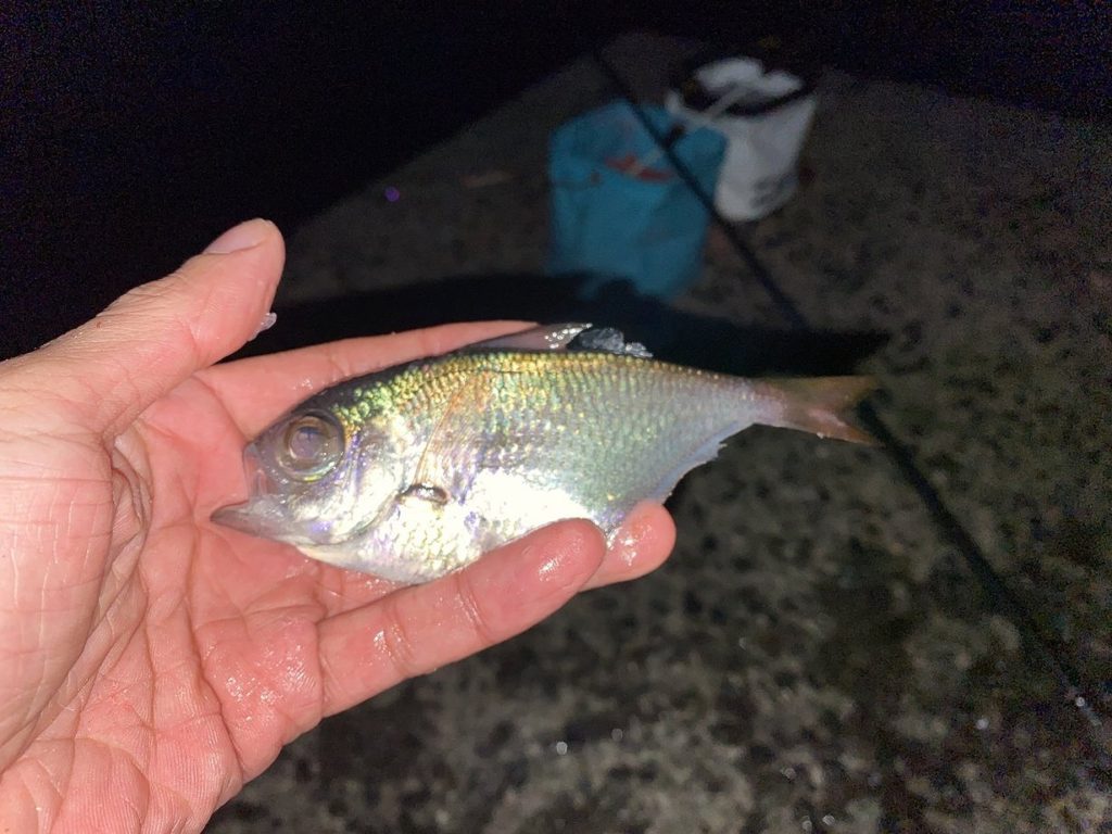 釣れない釣りに寒さに震える夜を覚悟しましたが、マキエを撒くとなんと毎投ごとにアタリ。上がってきたのは伊豆の夜釣りで毎度お馴染みのミナミハタンポでした。