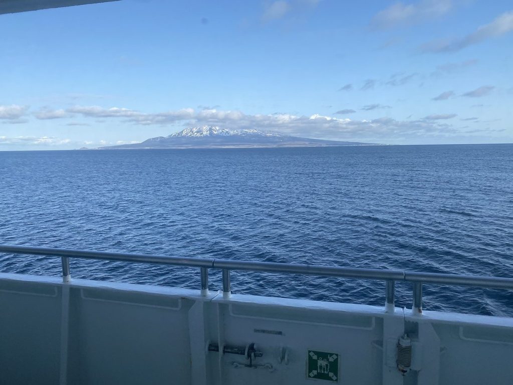 船上からは、特急宗谷からも見えていた利尻島が見えました。利尻島は別名利尻富士ともいいますが、綺麗な成層火山で、山麓まで雪を冠している姿は確かに富士山に似ています。というか、成層火山自体が世界的に特に珍しいものではなく、世界には富士山に似ている山がいくつもあるようです。トリップアドバイザーのこちらの記事が面白かったので皆様も是非ご覧ください。