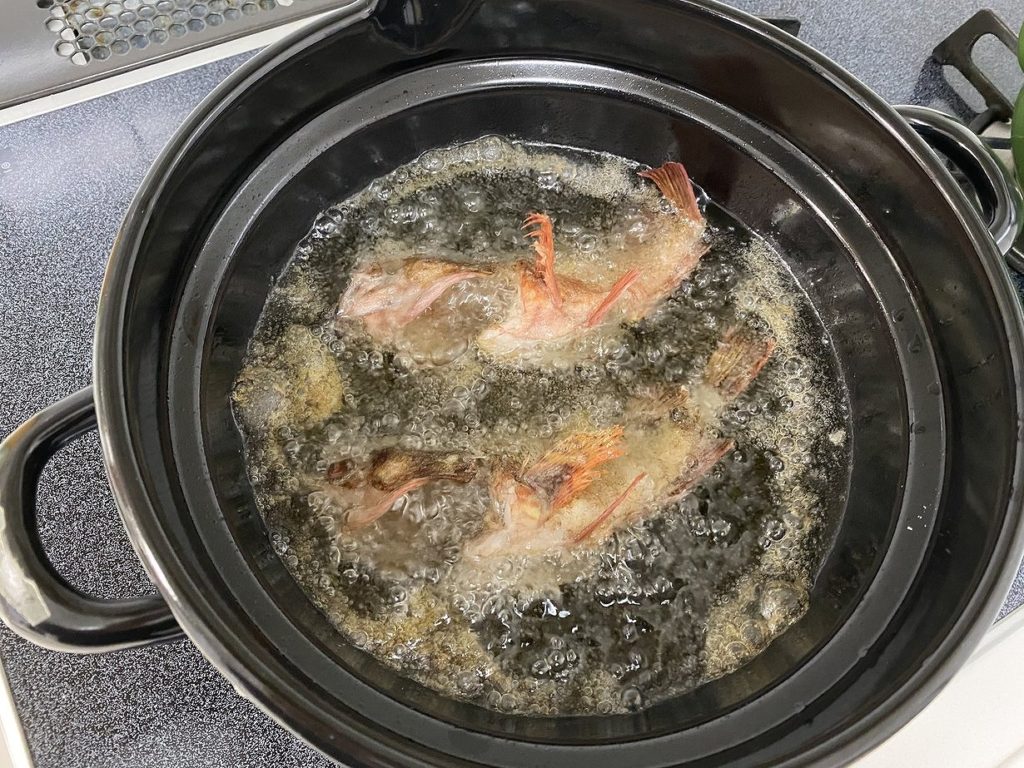 このサイズのカサゴの食べ方なのですが、私は姿揚げにすることが多いですね。味よし、見た目よしでカサゴの良さが引き立つ一品です。